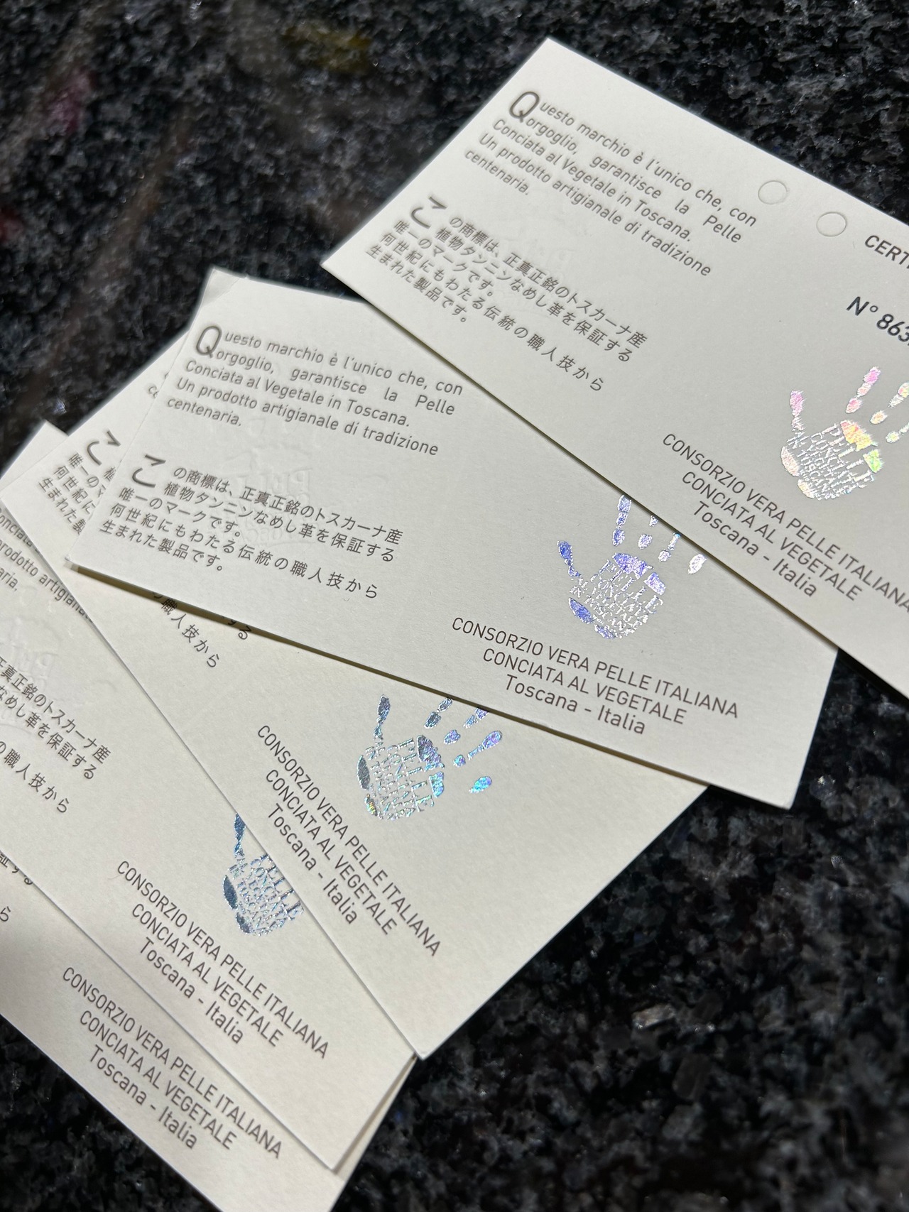 正規代理店から仕入れた革ですので、イタリアタンニン鞣し革協会加盟タンナーの革を使って制作された事を証明するシリアルナンバー入り製品ラベルが付属します。