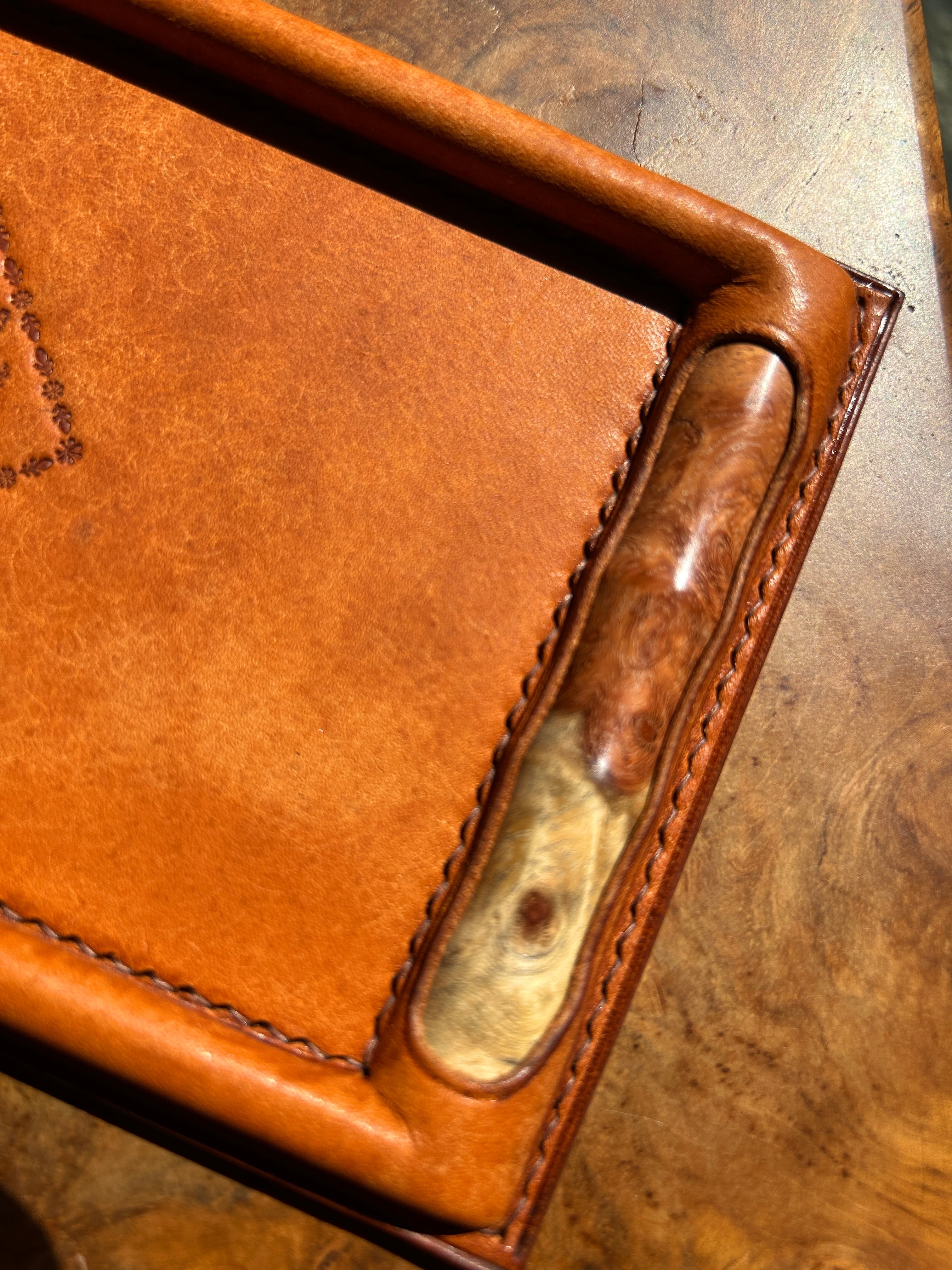 革のしなやかさと銘木の自然が生み出した美しい杢