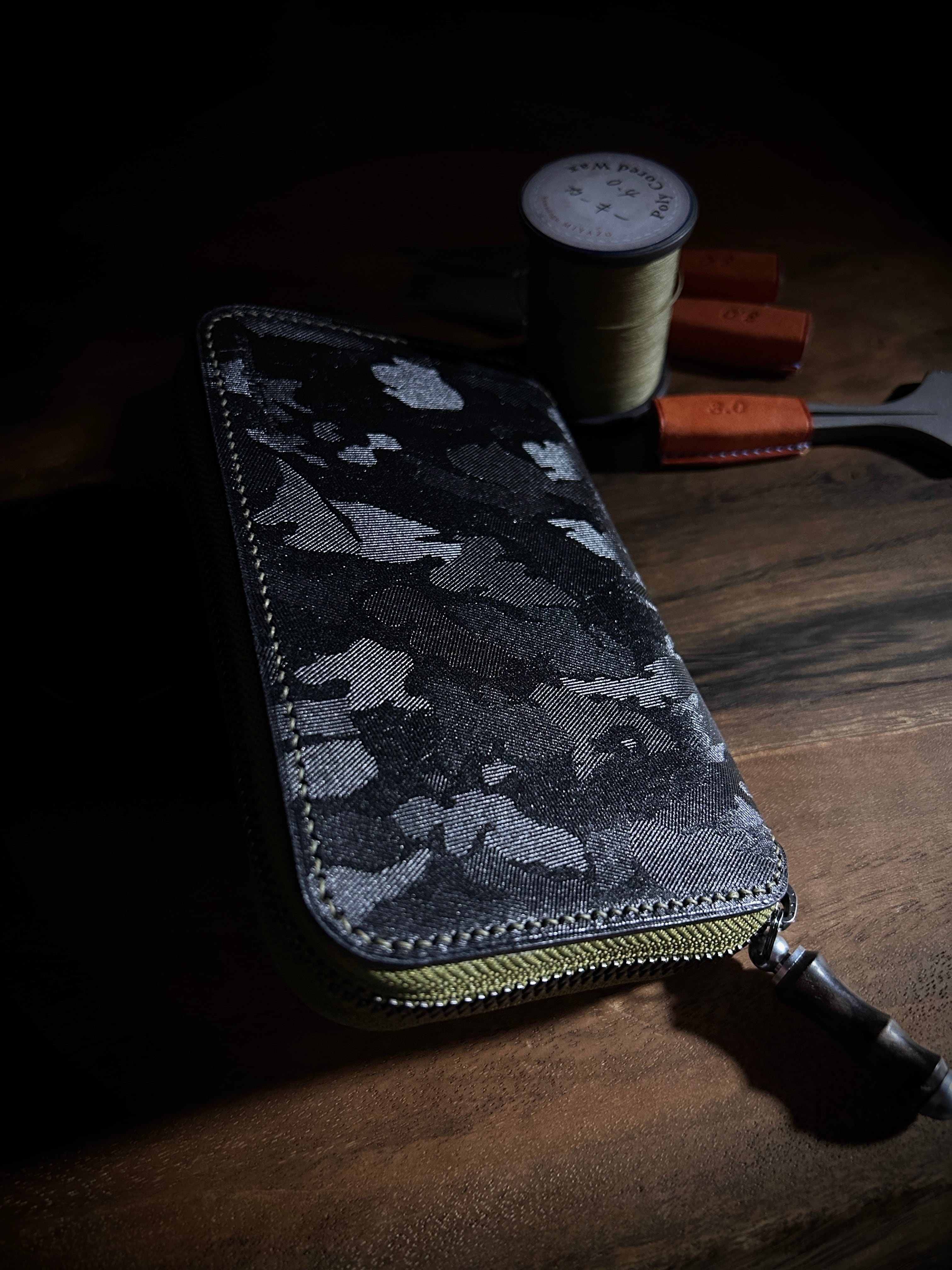 ペンケースミドル 猪革迷彩 黒×緑 ペンネクタイ付属