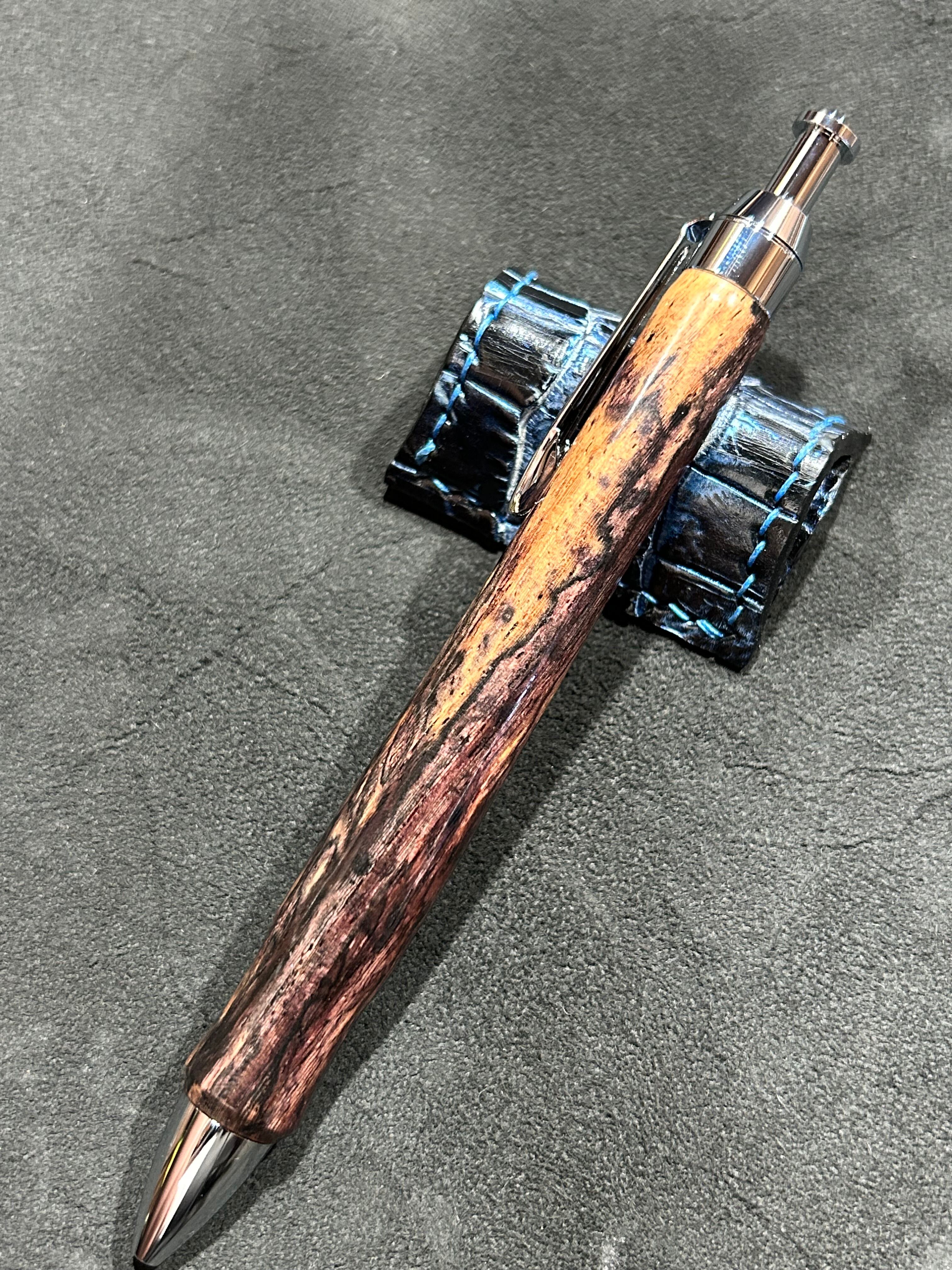 黒柿に見られる孔雀杢の様な面白い杢が入る物もあり、非常にレアですが、その中でも孔雀杢に緑の班が出る物もあります。