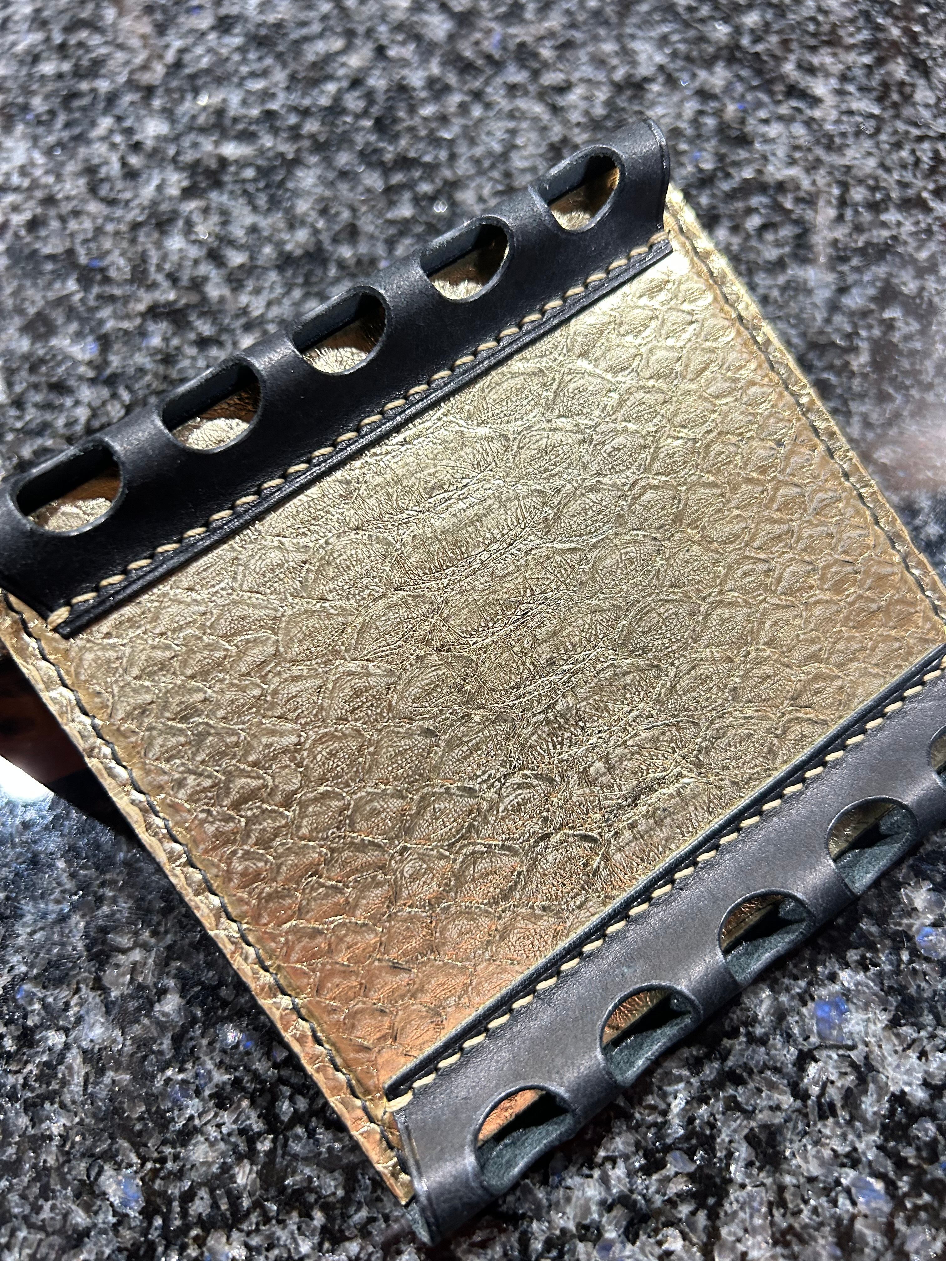 金箔加工をしたパイソンに私自身でスクラッチ加工を施した革です。